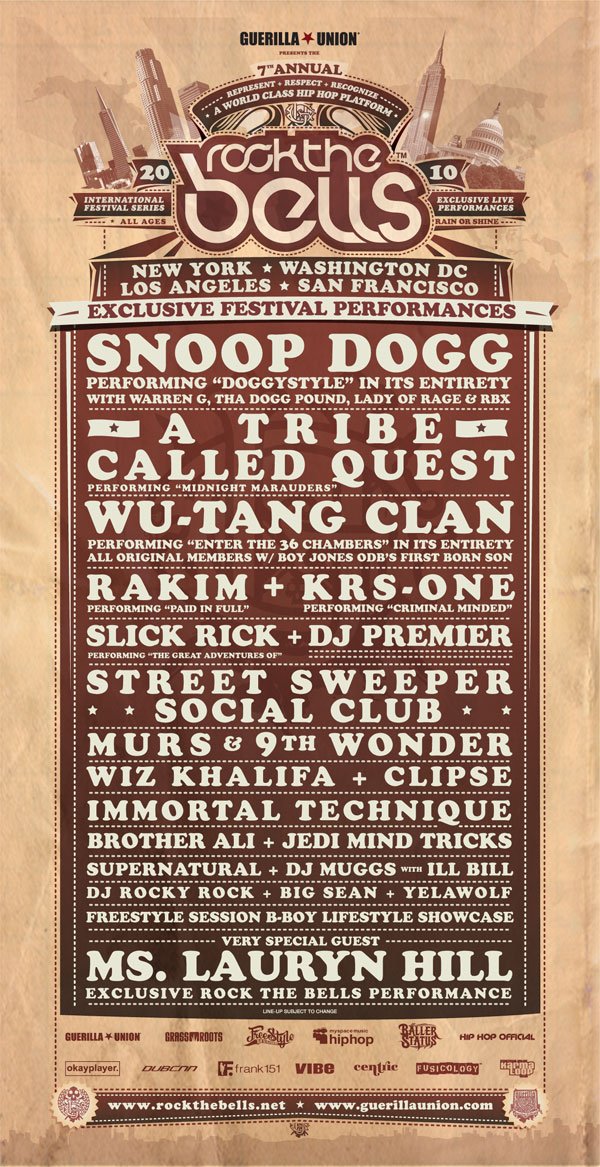 A Tribe Called Quest, Wu-Tang Clan, Slick Rick, Rakim, KRS-One, Street Sweeper Social Club, Murs & 9th Wonder, Wiz Khalifa, Clipse, Immortal Technique, Brother Ali, Jedi Mind Tricks, Supernatural, DJ Muggs with Ill Bill, Big Sean, Yelawolf, DJ Rocky Rock, Plus very special guest Ms. Lauryn Hill – MORE TO BE ANNOUNCED!